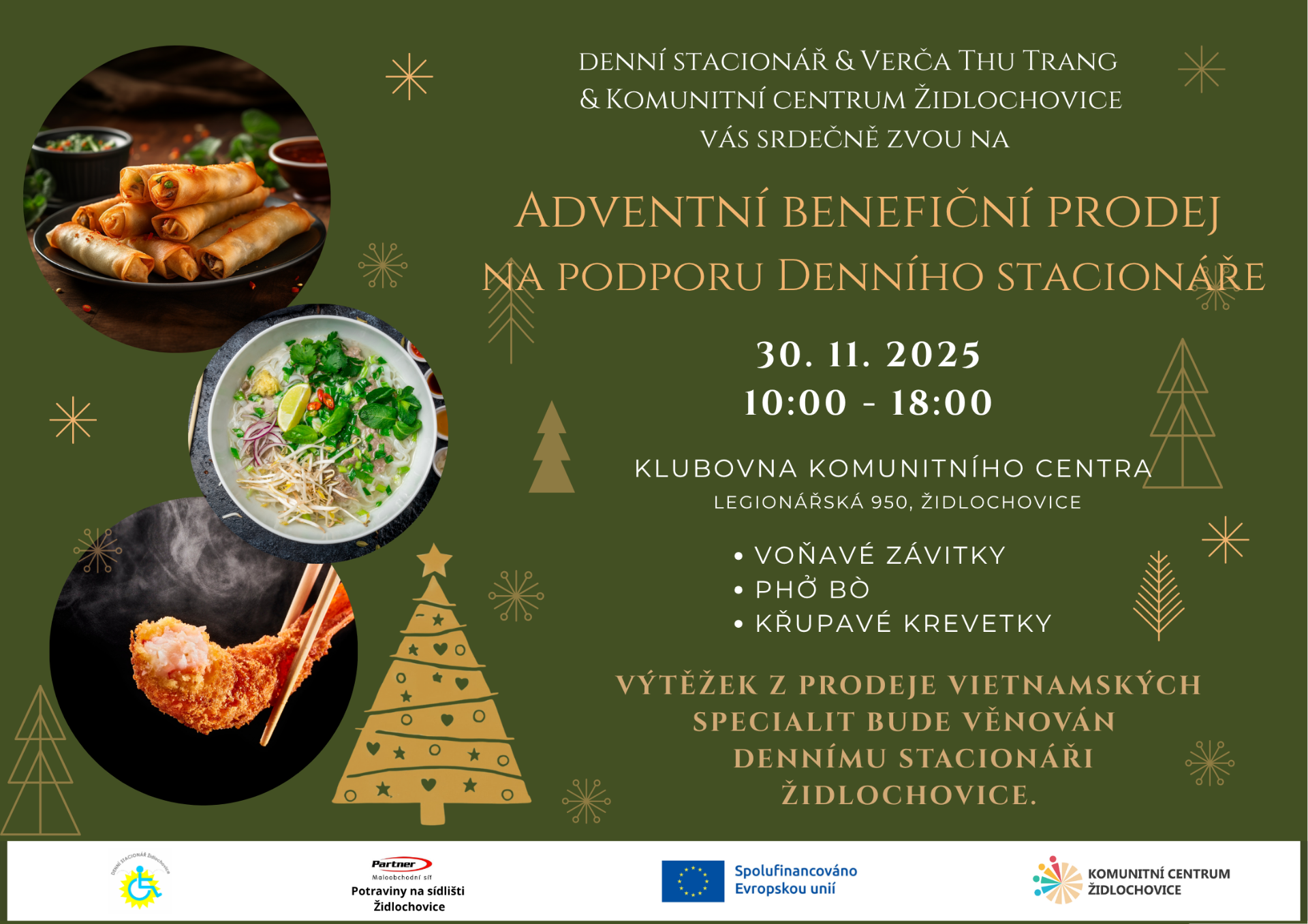 Na první adventní neděli si nemusíte plánovat co uvaříte. Přijďte si k nám koupit některou z čerstvých voňavých vietnamských specialit. Závitky, krevetky, Phó bó si můžete vychutnat s o to lepším pocitem, že přispíváte na Denní stacionář Židlochovice. Stacionář, který pečuje o lidi s handicapem, vytváří jim plnohodnotný program a podporuje je v rozvoji jejich kompetencí.