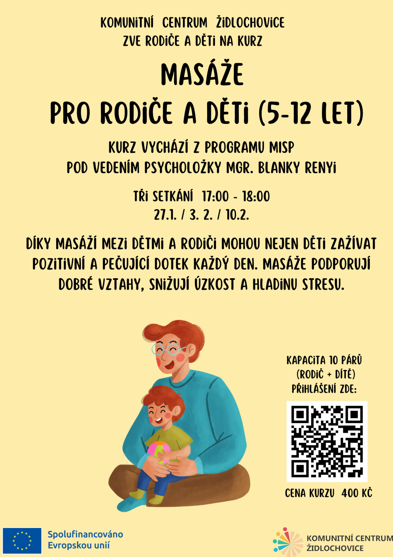 Rádi bychom vás pozvali na další běh kurzu Masáže pro rodiče a děti. Kurz se bude konat již potřetí a provázet bude účastníky opět naše paní psycholožka Mgr. Blanka Renyi.
